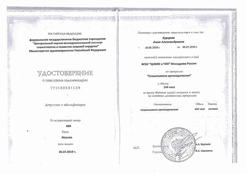 2019 г. – Удостоверение о повышении квалификации «Стоматология ортопедическая» в ФГБУ «Центральный научно-исследовательский институт стоматологии и челюстно-лицевой хирургии» МЗ РФ