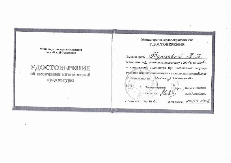 2004 г. – Ординатура «Ортодонтия» в Смоленская государственная медицинская академия г. Смоленск