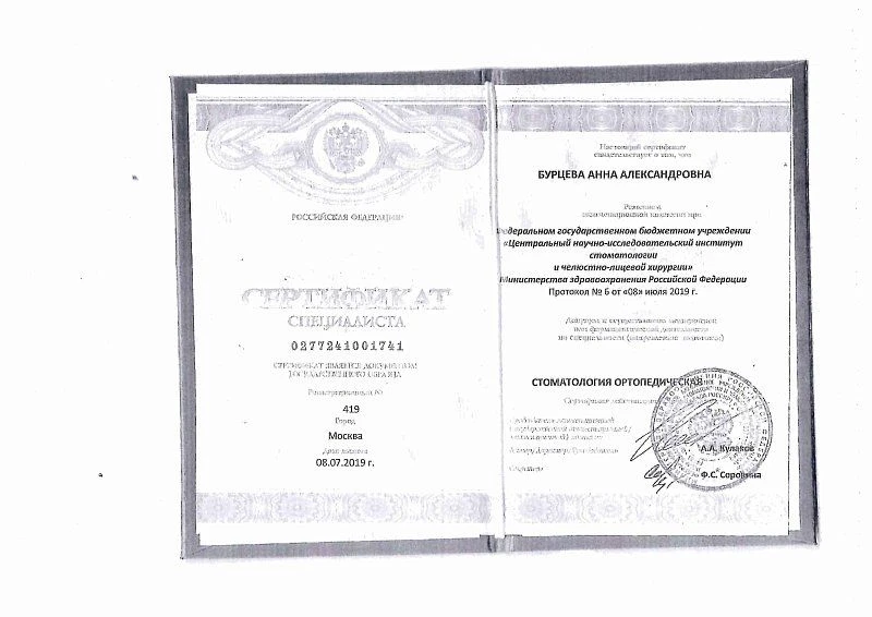 2019 г. – Сертификат «Стоматология ортопедическая» в ФГБУ «Центральный научно-исследовательский институт стоматологии и челюстно-лицевой хирургии» МЗ РФ