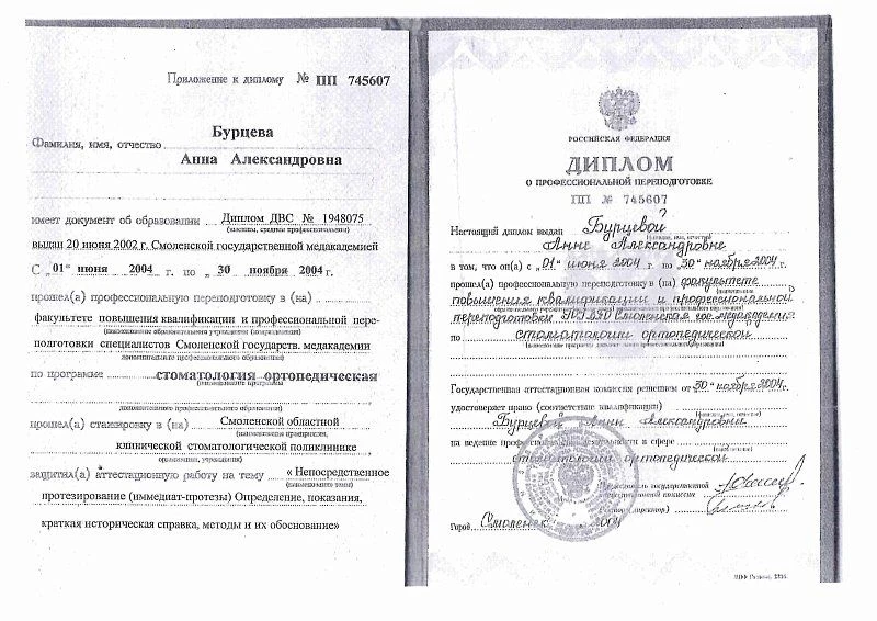 2004 г. – Смоленская государственная медицинская академия первичная переподготовка в ортопедической стоматологии.